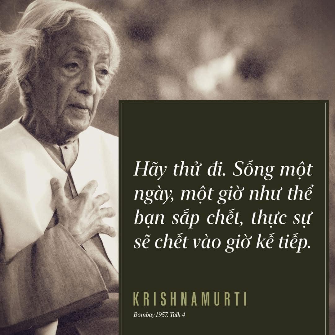 Nếu bạn biết mình sắp chết, bạn sẽ làm gì? Bạn sẽ tập hợp gia đình lại, sắp xếp tiền bạc và tài sản, rồi lập một di chúc. Sau đó, khi cái chết đang đến gần, bạn sẽ phải hiểu tất cả những gì bạn đã từng là. Nếu bạn chỉ đơn thuần sợ hãi vì bạn sắp chết, thì cái chết đó sẽ chẳng có ý nghĩa gì. Nhưng bạn sẽ không sợ hãi nếu bạn nói: “Tôi đã sống một cuộc đời nhạt nhẽo, tham vọng, ganh tỵ và ngu ngốc, và bây giờ tôi sẽ xóa sạch tất cả những điều đó khỏi ký ức của mình. Tôi sẽ quên đi quá khứ và sống trọn vẹn trong giờ này.” Nếu bạn có thể sống trọn vẹn một giờ như thế, bạn có thể sống trọn vẹn cho phần đời còn lại của mình.